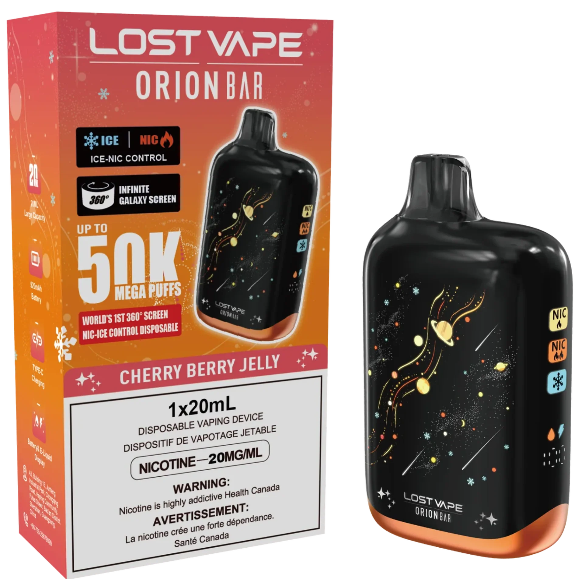The Lost Vape Orion Bar 50K delivers up to 50000 puffs with a 28 mL prefilled capacity and 2% nicotine strength. It features an adjustable ice and nicotine levels, a 360° Infinite Galaxy display, and a 920 mAh rechargeable battery with USB-C charging.